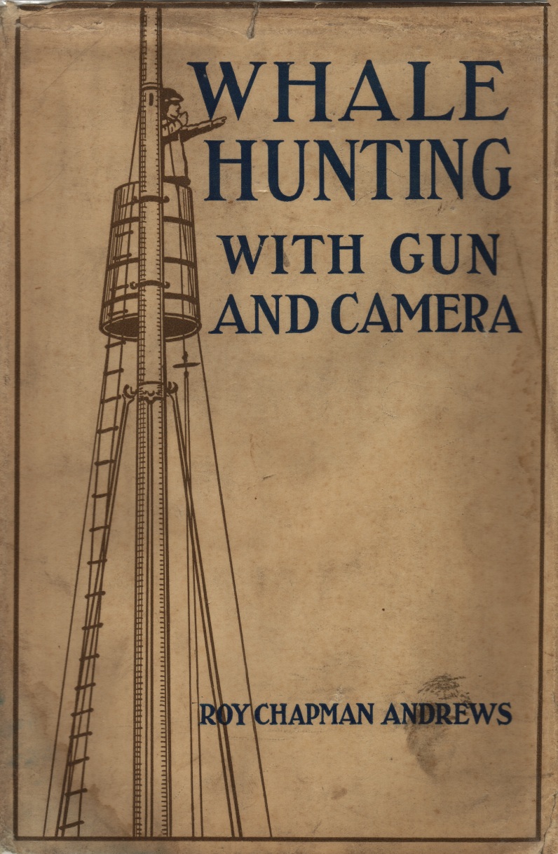 Andrews’ first book; Whale Hunting With Gun And Camera was a gamble for D. Appleton & Co. The as yet unknown Andrews had written an ambitious book, that until the 1960’s, would remain the most comprehensive study of whale behaviour published. The compelling and exciting images of whale hunting, and previously unseen images of living whales were a departure from Appleton’s normal stock. Ahead of its time, it would have been a risk to publish in the best years, and 1916 was not a good year. America had not yet joined the fight against Germany, but the global effects of W.W.I had already driven the cost of book publication up by 25%. Few publishers could risk committing to a new writer who may not sell. However, Whale Hunting With Gun and Camera does appear to have sold well enough, as there were five printings between 1916 and 1935. Now difficult to obtain in any condition, the first edition, first printing of the heavy photo-illustrated book is scarce. In thirty-one years of collecting Andrews I have located only one first edition copy in the original illustrated dust wrapper. All subsequent printings were issued in a sickly green wrapper with blue titles and no illustration, and the cloth binding lacks the gilt design on the cover.